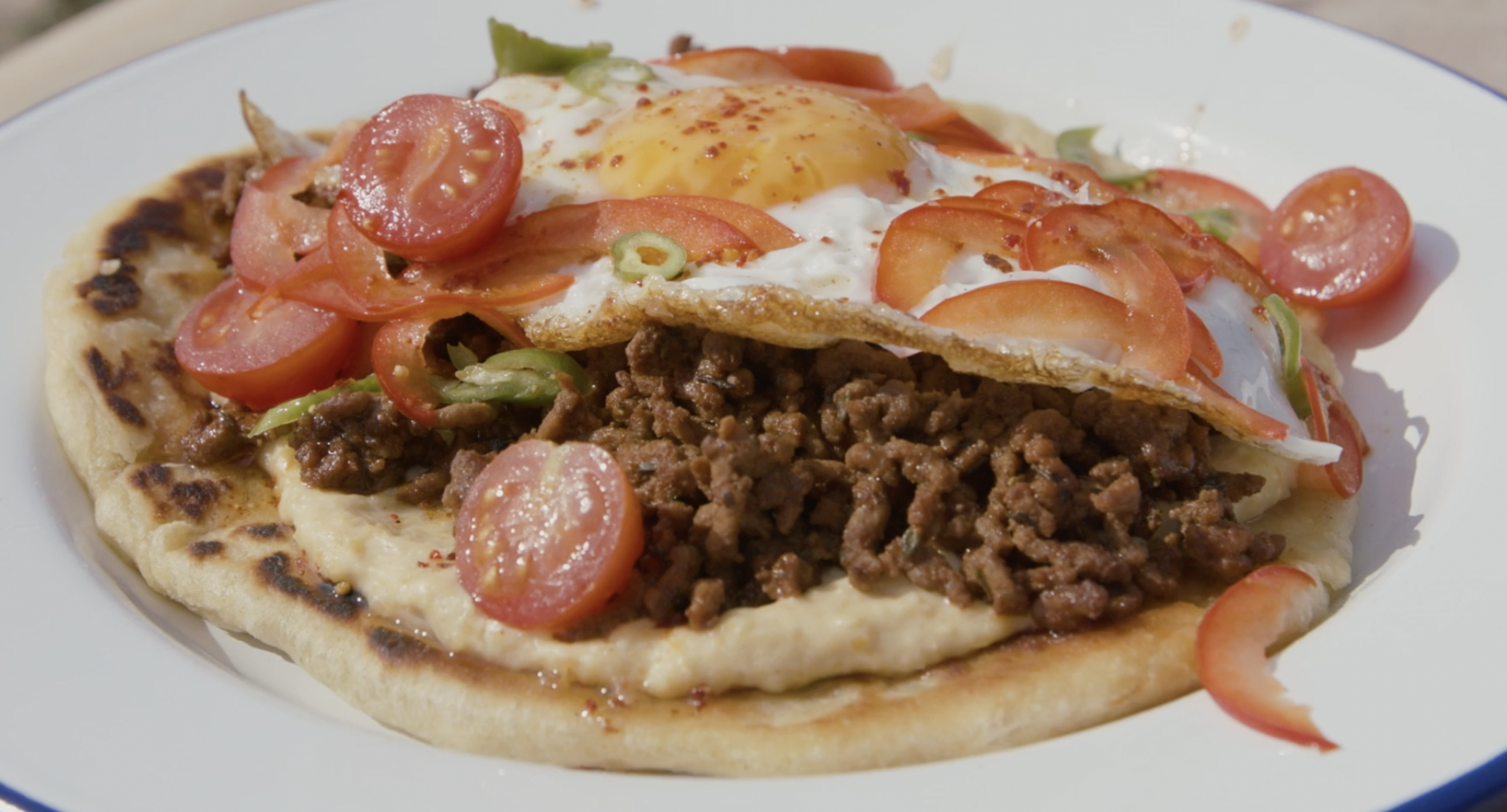Spicy mince flatbread with fried egg, hummus, pepper, tomato, and chilli